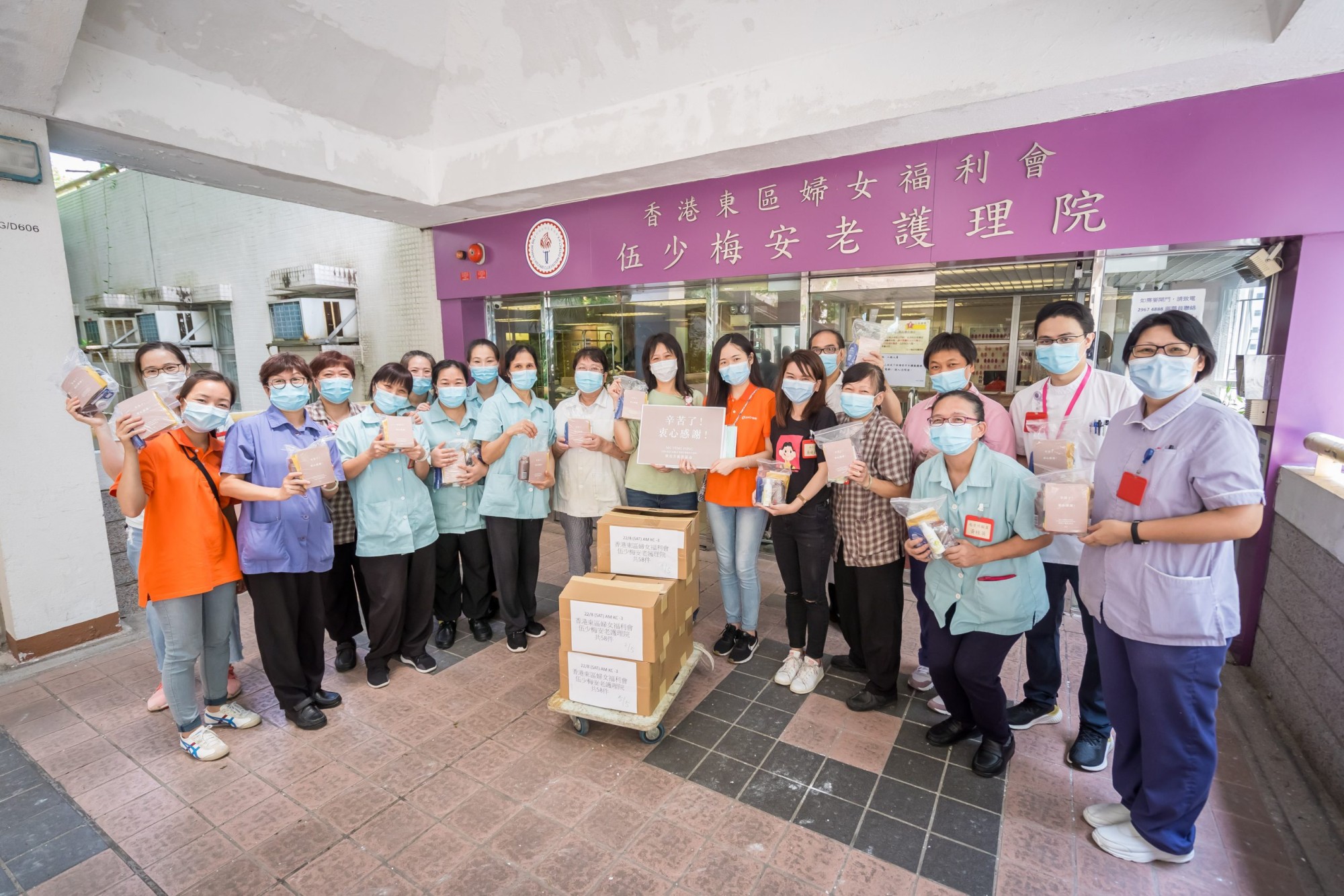 The gift packs customised for the needs of colleagues working at elderly homes included nutrition drinks, vitamin tablets, pain relief patches and disinfection products. With the support of over 20 volunteers, around 4,200 gift packs were prepared for the 2-day delivery.