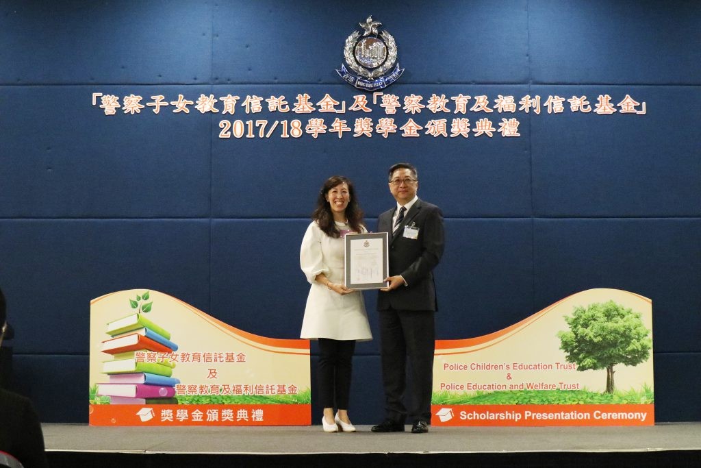 「警察子女教育信託基金」支持初級警務人員子女的獎學金及補助金支出,鼓勵他們勤奮向學和貢獻社會。「警察子女教育信託基金」和「警察教育及福利信託基金」2017/18學年獎學金頒獎典禮於2018年8月21日在警察總部舉行。黃廷方慈善基金董事黃敏華於典禮上獲警務處處長盧偉聰致送感謝狀。